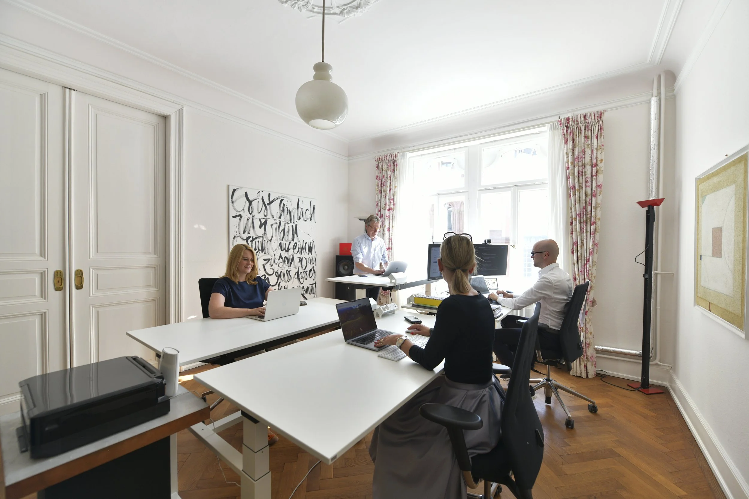 Ob an einem unserer Desks oder in Deinem eigenen Raum - bei uns findet jeder genug Platz sich zu entfalten. Und unsere Werkstatt-Küche bringt am Ende alle bei Kaffee oder Rheingauer Wein zusammen.